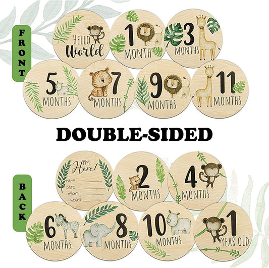 Safari Animals Wooden Milestone Cards Baby Wooden Circles - Newborn Baby Shower Gift Monthly Wooden Discs Hello World Milestone Pregnancy